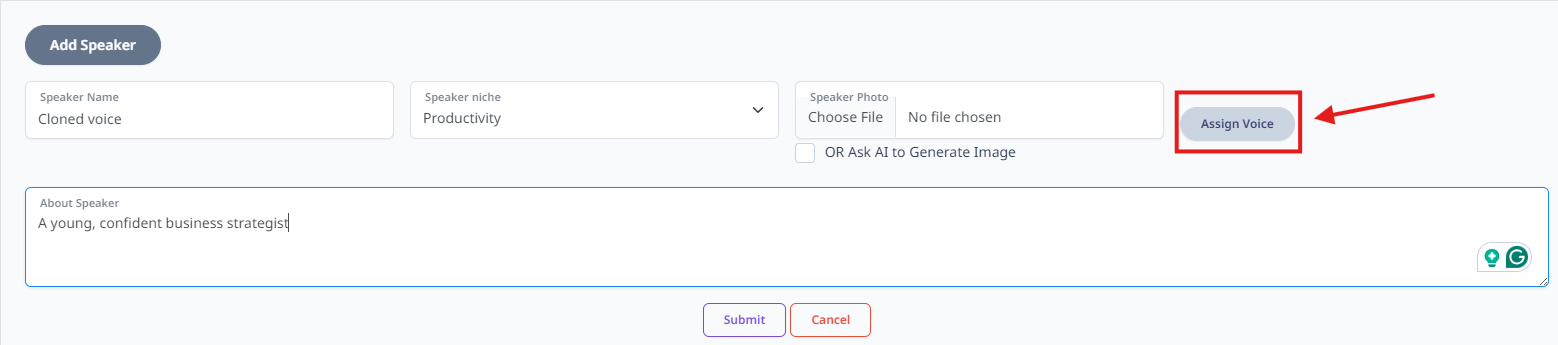 - Upload any image you want for the speaker or you can ask AI to generate the image